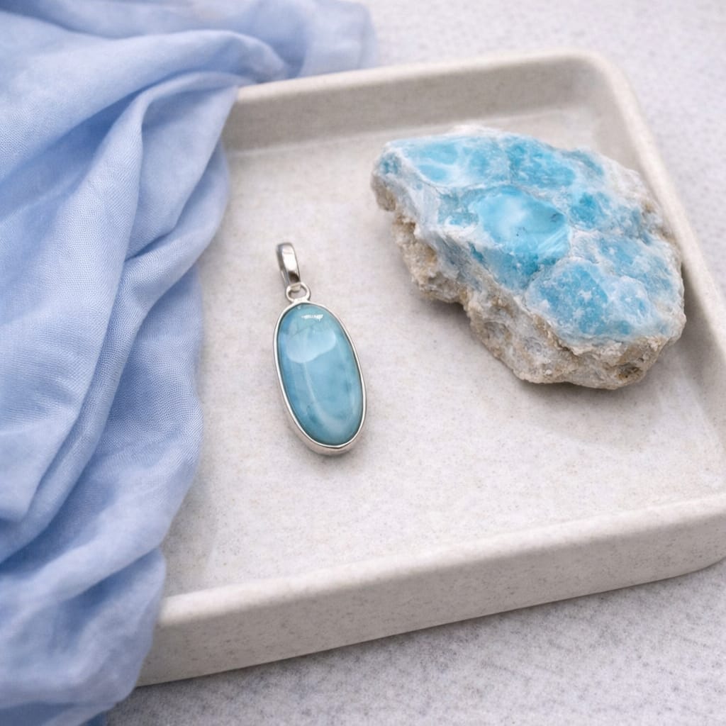 " A pedra Larimar é uma gema rara de coloração azul e azul esverdeada , encontrada exclusivamente na Republica Dominicana, no Caribe. Também conhecida como A PEDRA DO ATLANTICO ou a PEDRA DA TRANQUILIDADE.''